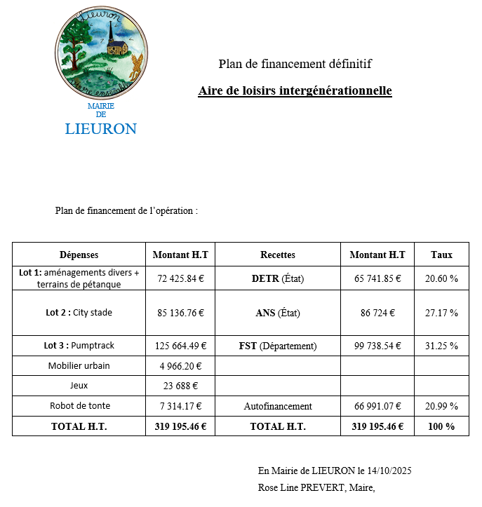 - Le Conseil municipal de Lieuron a décidé de créer une aire de loisirs qui va permettre à plusieurs générations de se rencontrer. Ce lieu de rassemblement se veut accessible à tous. Il va permettre de faire de l’activité physique, mais aussi de créer des échanges. Il va se situer à côté des terrains de foot. Il va être composé d’un city stade, de terrains de pétanque, d’un pump track, d’un baby-foot, d’une table de tennis de table, et enfin d’une araignée de grimpe. Il va également disposer de bancs et de tables de pique-nique afin d’en faire un endroit convivial.
