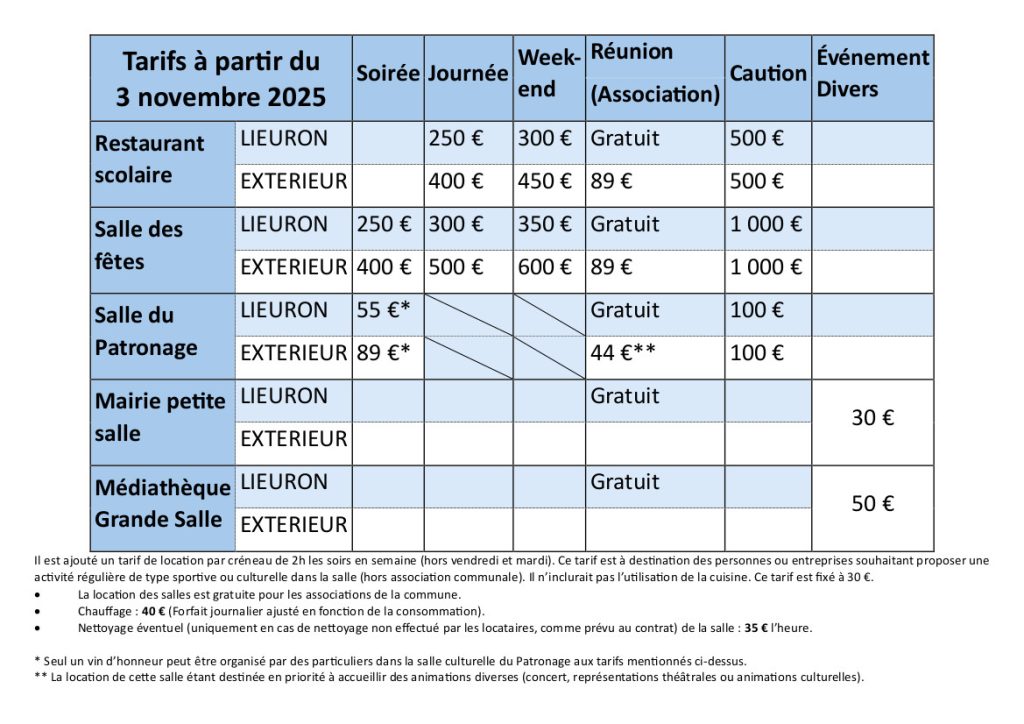 Vous trouverez ci-dessous les tarifs des salles en location
